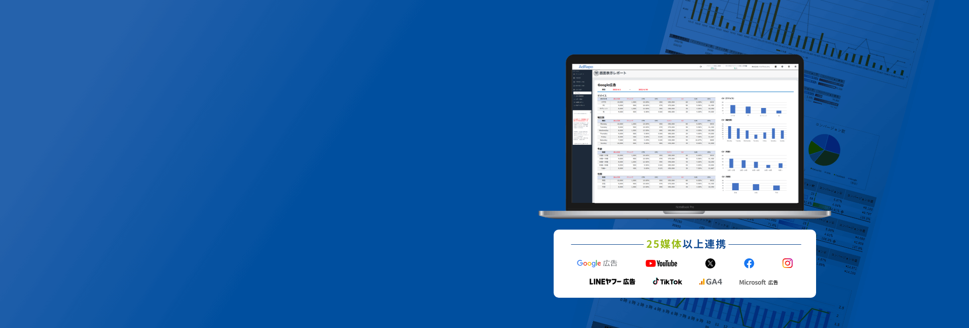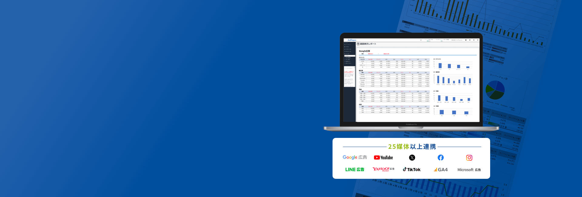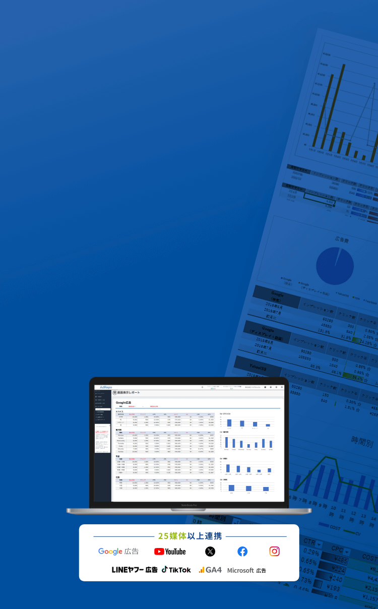 媒体数25社以上に対応主要媒体(Google、Yahoo!、Facebook、X、LINEなど)に対応しています。また今後も対応媒体は、順次増やしていく予定です。