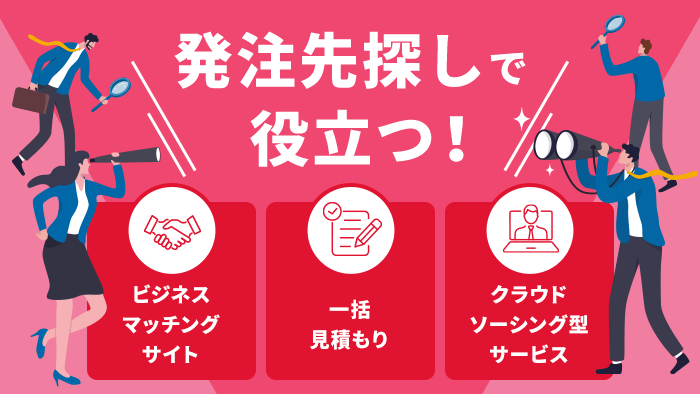 今回は、発注先探しでおすすめのサービス16選をご紹介します。 一口に「ビジネスマッチング」と言っても、大きく「コンシェルジュ型」「一括見積もり型」「クラウドソーシング」など、いくつかのタイプに分かれていることをご存知でしょうか?