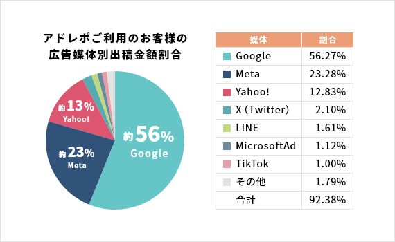 Webマーケティングを展開する場合、Meta広告だけで勝負するのはいささか攻めすぎかもしれません。私たちイルグルムが提供するアドレポ(広告レポート自動化ツール)での統計によると、Web広告の出稿媒体のうち、Meta広告は第2位の約23%を締めるものの、第1位はGoogle広告が約56%とダントツの割合を占め、第3位のYahoo!広告も約13%と見逃せない数字です。
