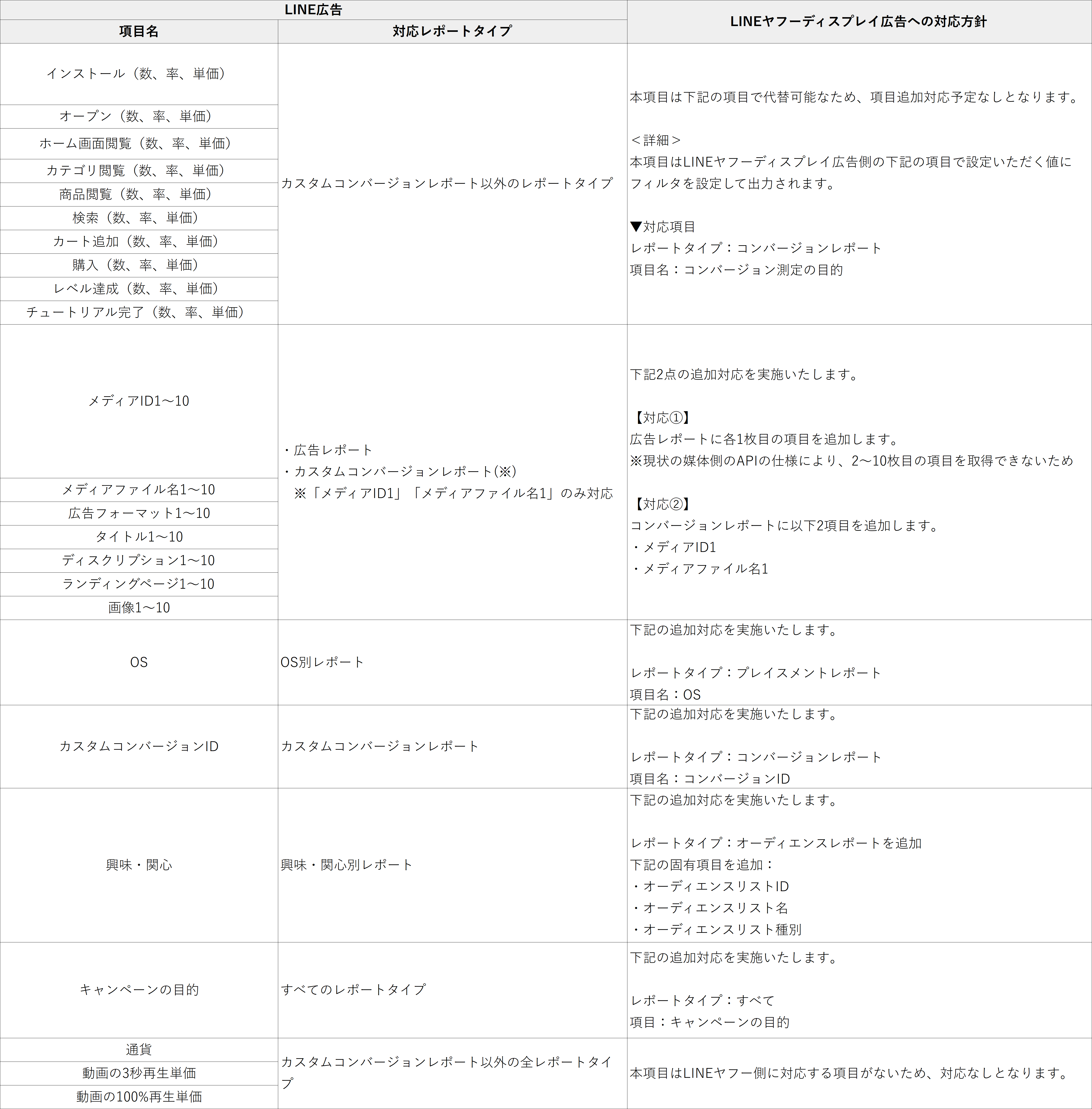 現在、アドレポでプラットフォーム「LINE広告」を指定して出力できる項目のうち、「LINEヤフーディスプレイ広告」で出力できない項目について、以下のとおり対応いたします。