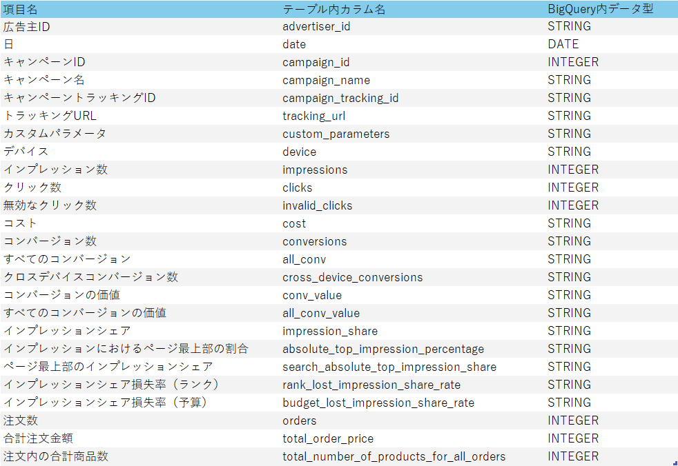 ※用意される表示項目は「BigQuery連携への影響>1、新規テーブルの追加」よりご確認ください。