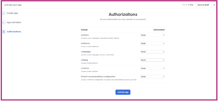 6.Authorizationのセクションにて、全ての行でReadを選択の上、「Activate app」をクリックする。