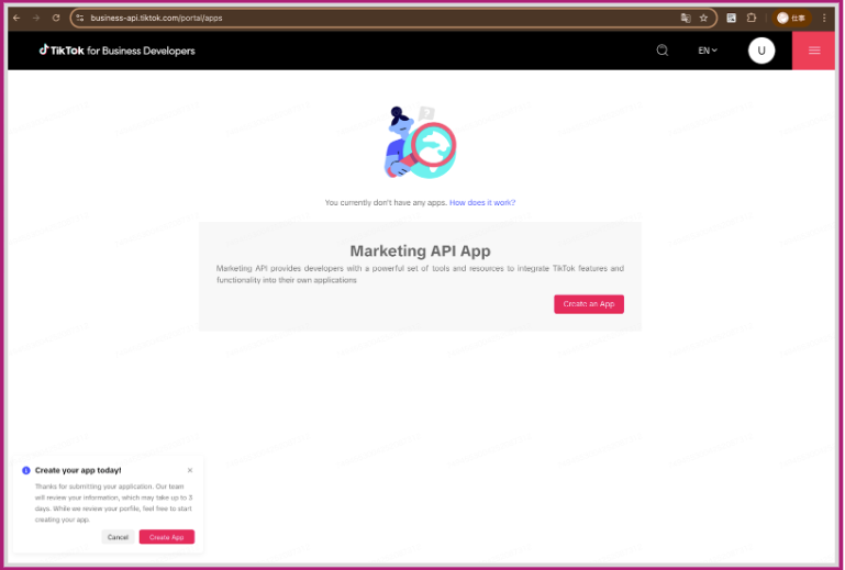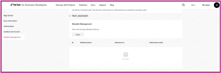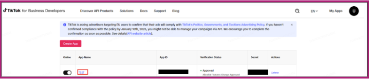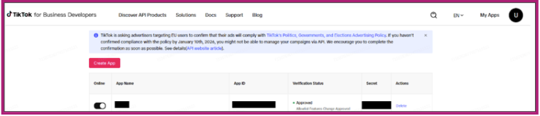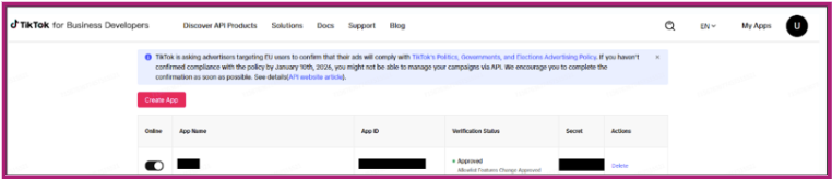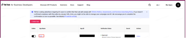 App IDとSecretはTikTok API for Businessの「My Apps」のページにて確認いただけます。
