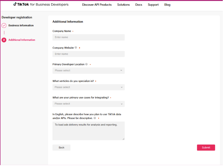 (3)画面内のSubmitをクリックすると、TikTokデベロッパーの登録が完了します。