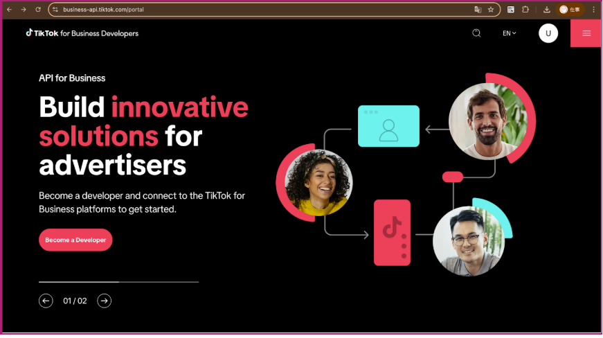 (1)TikTok API for Businessにログインし、画面内の「Become a Developer」を選択ください。