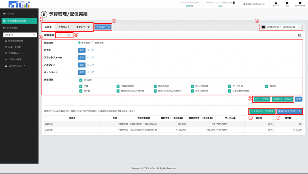 予算管理画面では、登録された広告主の予算設定データをもとに予算の消化状況を閲覧できます。