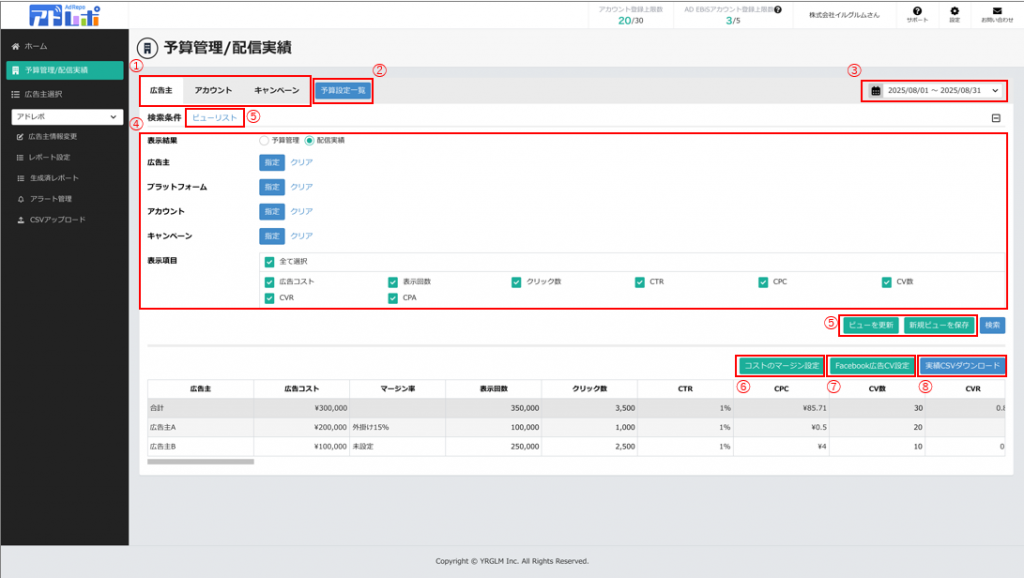 | ② | 予算設定一覧 | 「予算設定一覧」画面に遷移できます。 予算管理データを表示するためには、あらかじめ「予算設定一覧」画面上で予算を登録する必要があります。 「予算設定一覧」画面の詳細はこちら https://ad-repo.com/support/budget_delivery/9937/ |