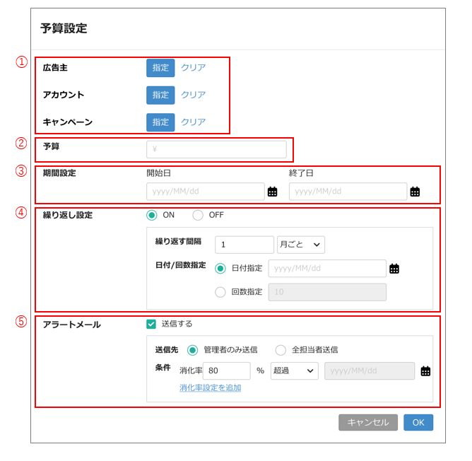 | ③ | 予算を適用する期間を入力してください。 繰り返し設定を有効にする場合は、終了日の入力が不要になります。 |