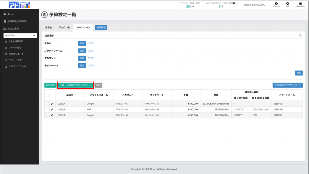 アラートメールを設定する場合は、CSV一括登録にてアラートメール以外のデータを登録後に個別で予算設定を編集して設定してください。