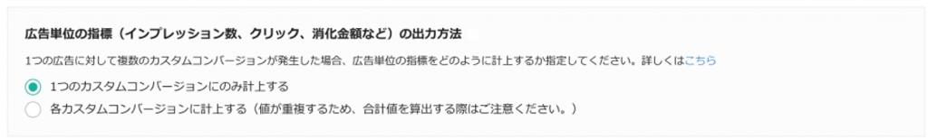 下記の対象箇所より、広告単位の指標(後述)の出力形式を「1つのカスタムコンバージョンにのみ計上する」もしくは「各カスタムコンバージョンに計上する」か、ご選択いただけます。