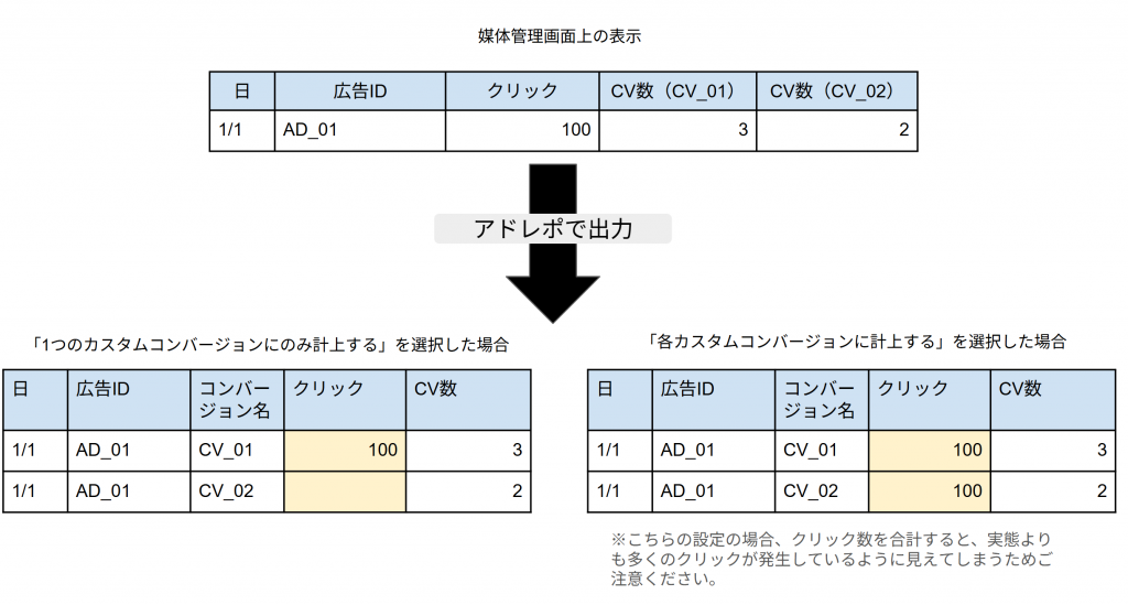 広告ID「AD_01」経由で、2種類のカスタムコンバージョン「CV_01」「CV_02」のCVが発生した場合